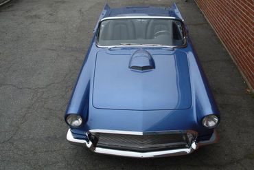 This car is a spectacular one-off built to the highest standards. It was built using a solid original 1957 Thunderbird, and comprehensively modified to make a wonderful multiple award winning car. The body was modified to incorporate a hand made grille and hood scoop, and the side trim and vents removed. The character line on the side of the body was modified accordingly. The bumpers were narrowed to fit the body more tightly, and the front turn signals removed. The rear fenders were modified accordingly to match the new profile of the rear bumper, and the external fuel filler removed and replaced with at trunk-mounted unit. Then, the car was painted with a 1996 Ferrari shade of blue.