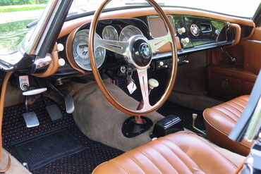 The interior is beautifully presented with rich, taut leather, with a distinguished, elegant, and warm butterscotch hue in keeping with materials one might find in premier luxury fashion offerings. The leather is beautifully creased, stitched, and tailored with details like stitched ‘flex-back’ map pocket pulls and hand crank chrome plated window handles. The interior is perfectly trimmed with correct piping and properly tufted seat pleats. The correctly trimmed and border trimmed low pile carpeting is in excellent condition, showing just mild evidence of use in the driver’s footwell. The rare factory hardtop is lined with proper felt gray, also in excellent condition. Finishes throughout the interior are exquisite including the beautiful dashboard displaying an elegant array of vividly preserved gauges still showing crisp lettering, and bright numeric indication. Further details include the delicately finished ashtray, the iconic black-banded wood-rimmed Nardi steering wheel proudly showing the central blue and white BMW propeller logo, echoing their aviation heritage. Excellent details continue throughout the car including the original patinaed seat lever knobs and beautifully finished dashboard control knobs. The stunning and elegant interior creates a handsome and fashionable presence, particularly so as it contrasts against the vivid black exterior.